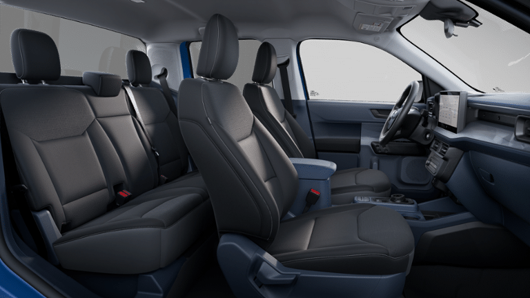 2.5L I-4 Hybrid, 2.91 Axle Ratio, 4-Wheel Disc Brakes, 6 Speakers, ABS brakes, Air Conditioning, AM/FM radio: SiriusXM with 360L, Apple CarPlay/Android Auto, Auto High Beams, Auto High-beam Headlights, Automatic temperature control, Brake assist, Bumpers: body-color, Compass, Delay-off headlights, Driver door bin, Driver vanity mirror, Dual front impact airbags, Dual front side impact airbags, Electronic Stability Control, Emergency communication system: SYNC 4 911 Assist, Equipment Group 100A, Exterior Parking Camera Rear, Front anti-roll bar, Front Bucket Seats, Front Center Armrest, Front Cloth Bucket Seats, Front License Plate Bracket, Front reading lights, Front wheel independent suspension, Fully automatic headlights, Illuminated entry, Internet access capable: FordPass Connect 5G, Knee airbag, Low tire pressure warning, Occupant sensing airbag, Outside temperature display, Overhead airbag, Overhead console, Panic alarm, Passenger door bin, Passenger vanity mirror, Power steering, Power windows, Pre-Collision Assist w/Automatic Emergency Braking, Radio data system, Radio: AM/FM Stereo w/6 Speakers, Rear anti-roll bar, Rear step bumper, Rear-View Camera, Remote keyless entry, SiriusXM w/360L, Speed control, Speed-sensing steering, Steering wheel mounted audio controls, SYNC 4 w/Enhanced Voice Recognition, Telescoping steering wheel, Tilt steering wheel, Traction control, Trip computer, Wheels: 17 Steel w/Sparkle Silver Painted Cover, 2.5L I-4 Hybrid. Blue 2025 Ford Maverick XL FWD CVT 42/35 City/Highway MPG